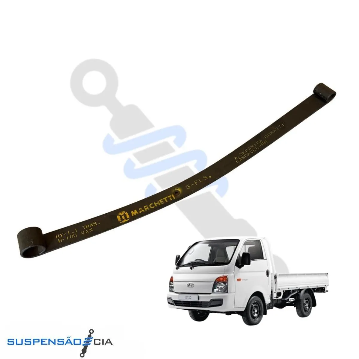 A Mola Mestre Traseira Marchetti HY-1.1 é a primeira e principal lâmina do feixe de molas do Hyundai H-100 com umbigo, compatível com os modelos de 1994 a 1999. Essa peça é responsável por suportar a maior parte do peso e manter a estabilidade da suspensão traseira, sendo essencial para veículos que operam com cargas constantes. Com fabricação robusta e medidas exatas, a mola oferece alto desempenho, resistência e encaixe perfeito, garantindo segurança e conforto na condução.
